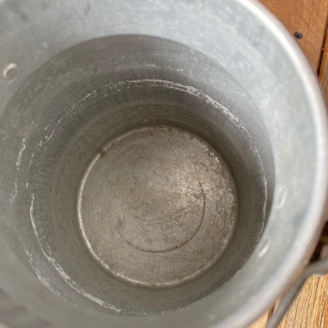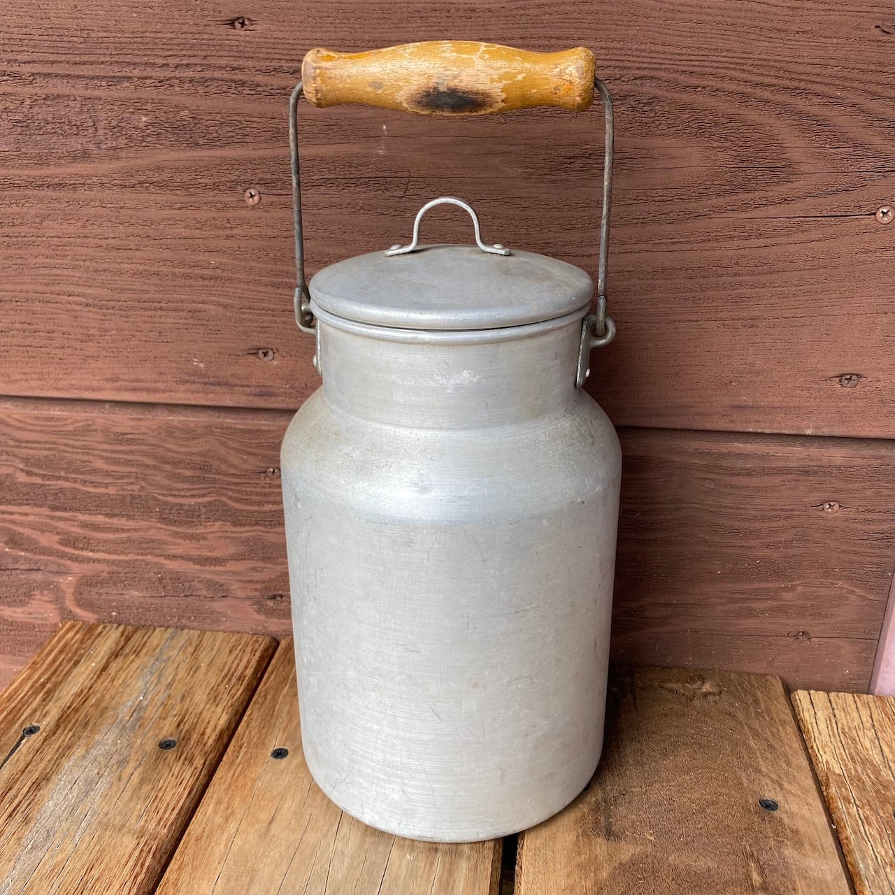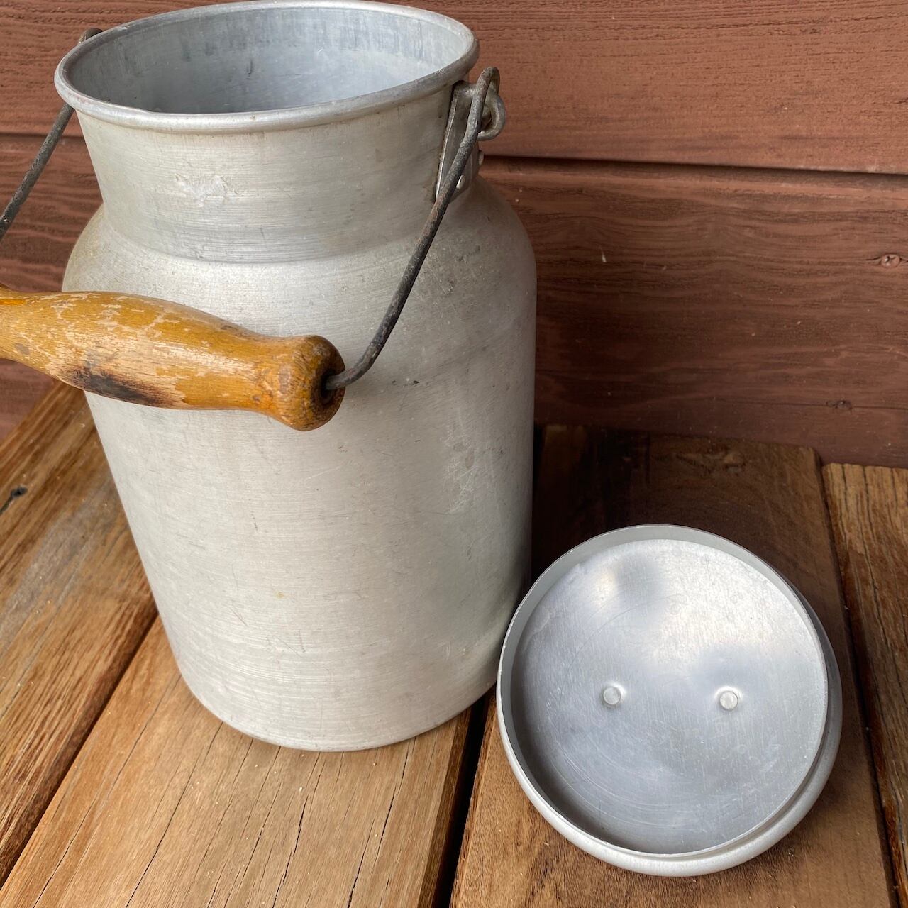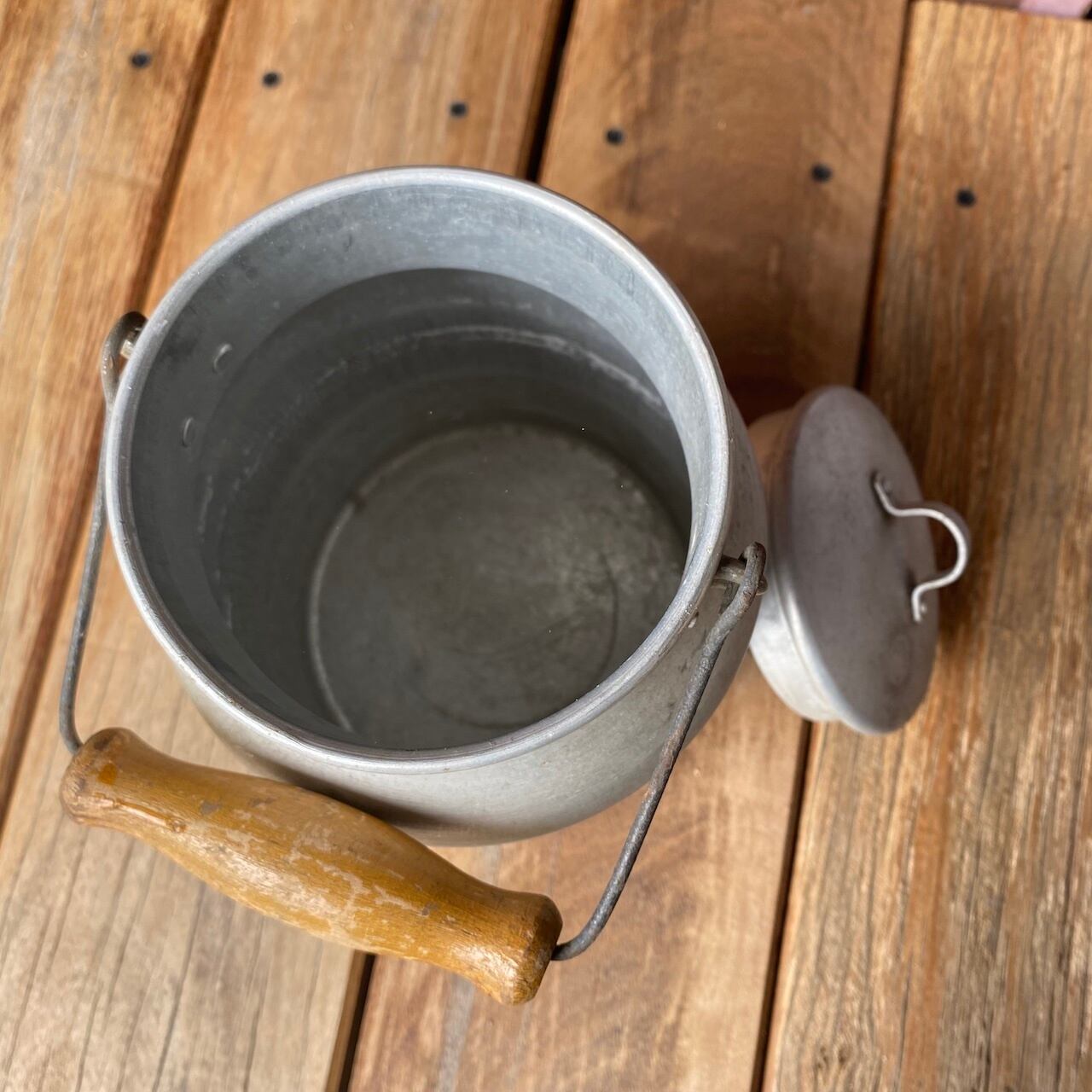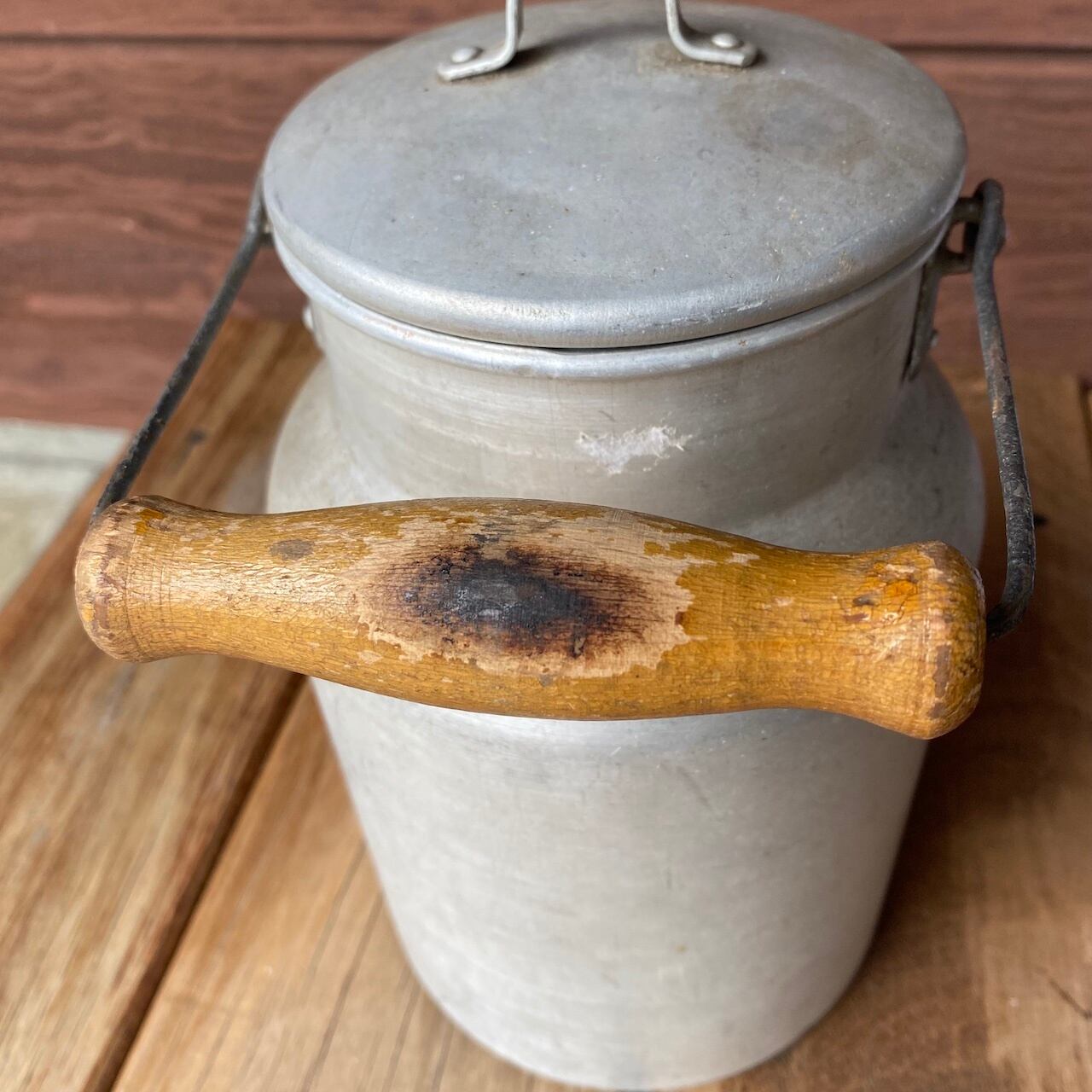 取っ手が少し焦げてちゃってるけど、アルミの質感がいい雰囲気のミルク缶です。底はしっかりしてて、水漏れも無いので、お花をざっくり生けたりして使うと可愛いかも( ´艸`)