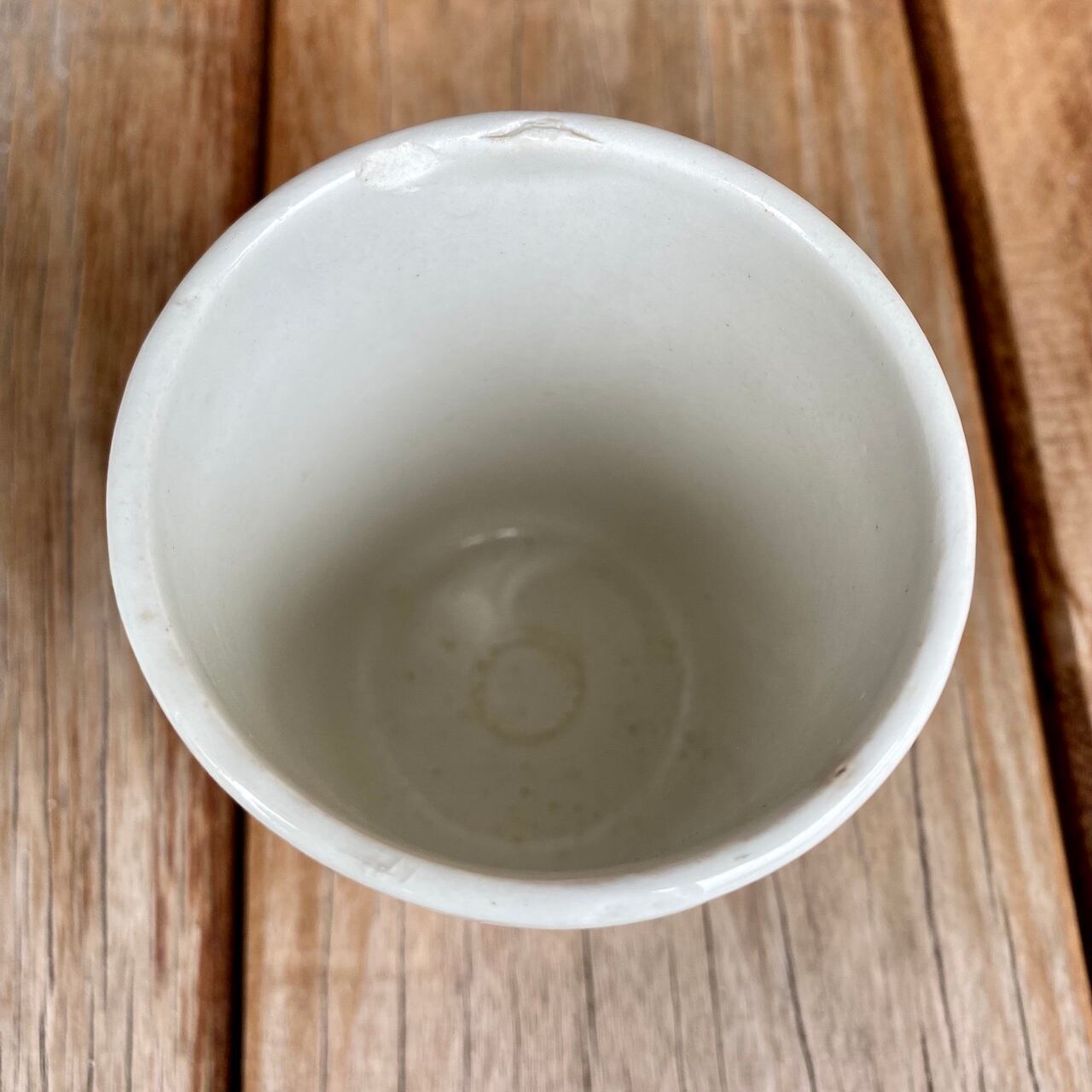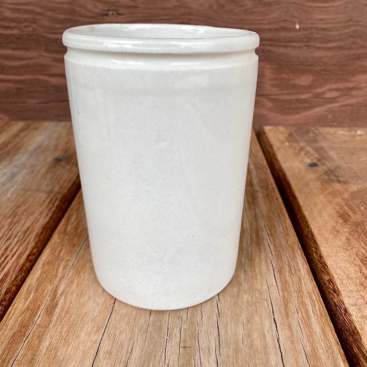 まだ瓶がなかった時に、この陶器に詰められ、紙で蓋をして糸や針金で巻いて売られていたそうです。上の溝は糸や針金を縛るところみたい。1930年代のもの。